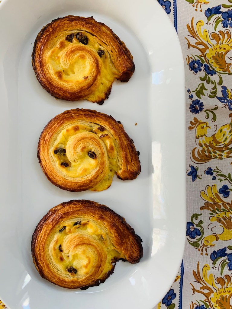For the filling: Pour boiling water over the raisins to cover and let soften for at least 30 minutes. Combine sugar and cornstarch in small saucepan. Combine yolks and milk in a measuring cup. Whisk milk into sugar mixture and heat over medium-low heat until the mixture starts to thicken. Continue whisking until the mixture is very thick and at least one bubble has popped. Remove from heat and whisk in vanilla extract. Strain, if you like (I don’t), into a bowl. Cut butter into pieces and whisk in butter a piece at a time until fully incorporated. Drain raisins and stir into pastry cream. Refrigerate until needed, stir vigorously to soften before using.