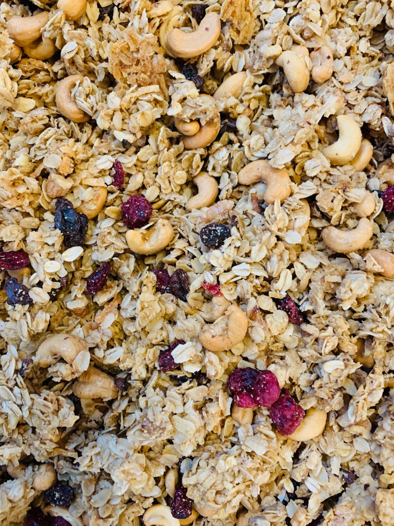 This is my favorite granola recipe – adapted from an Alton Brown recipe. This time I used cashews, Craisins AND raisins because I don’t want to get on Big Raisin’s bad side.