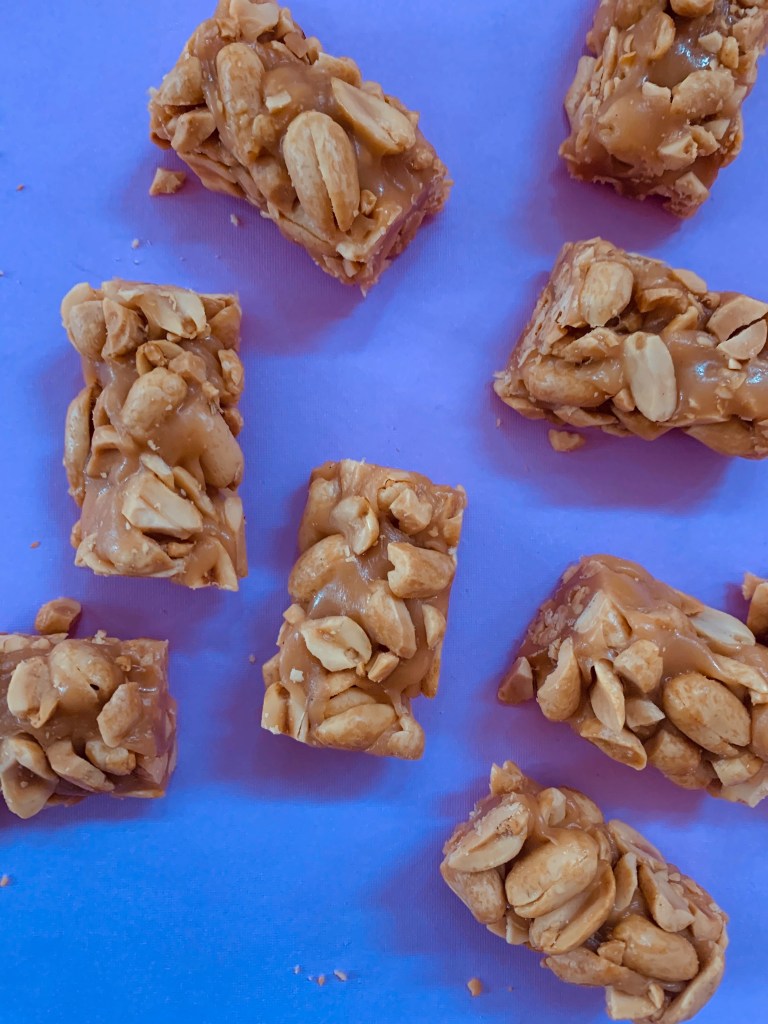 Let sit for 1 minute to cool slightly. Using a spoon or your fingers (carefully), cover the channel with peanuts thoroughly. Let sit for about 5 minutes, until the syrup has firmed up but is still warm. Using your hands, form the candy into a rope, pressing in peanuts as needed to cover all the bare spots. Keep working until the rope is uniform in size and thickness.