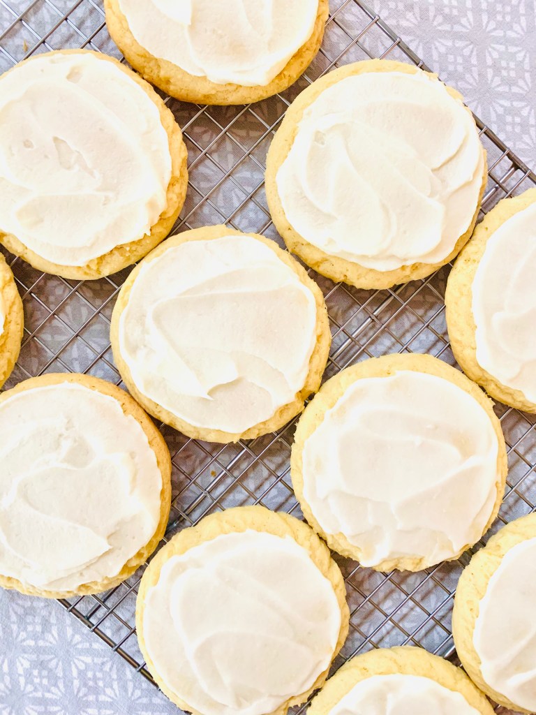 Stir together lemon juice, soft butter and powdered sugar until thick and spreadable. Thin with additional lemon juice, or thicken with additional powdered sugar until you reach a consistency that is thin enough to spread without dripping off the cookies.