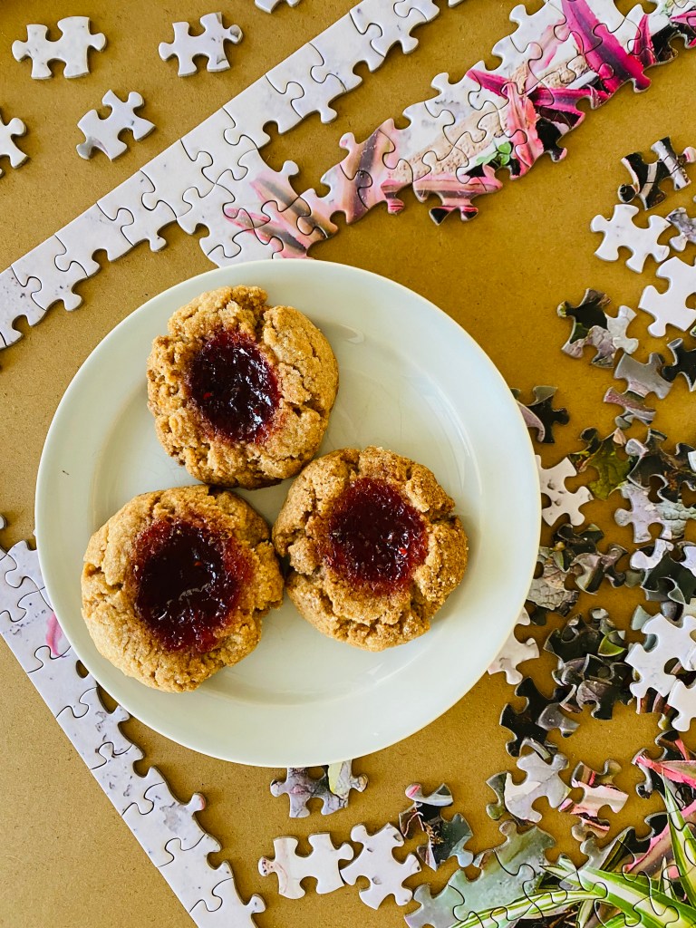 Form into balls using a cookie scoop or spoon, using about 2 tablespoons of dough per ball. Slightly flatten each ball with a flat-bottomed glass dipped in granulated sugar. Make an indentation in the center of the cookie using your finger or a teaspoon. Don’t sweat the cracks, unless the jam will leak out, then fix the crack. Fill indentation with jam.