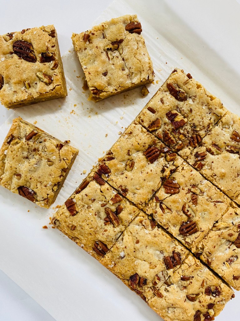 Blondies: Preheat oven to 350°F. Lightly grease a 9×13″ pan and line with a parchment sling.